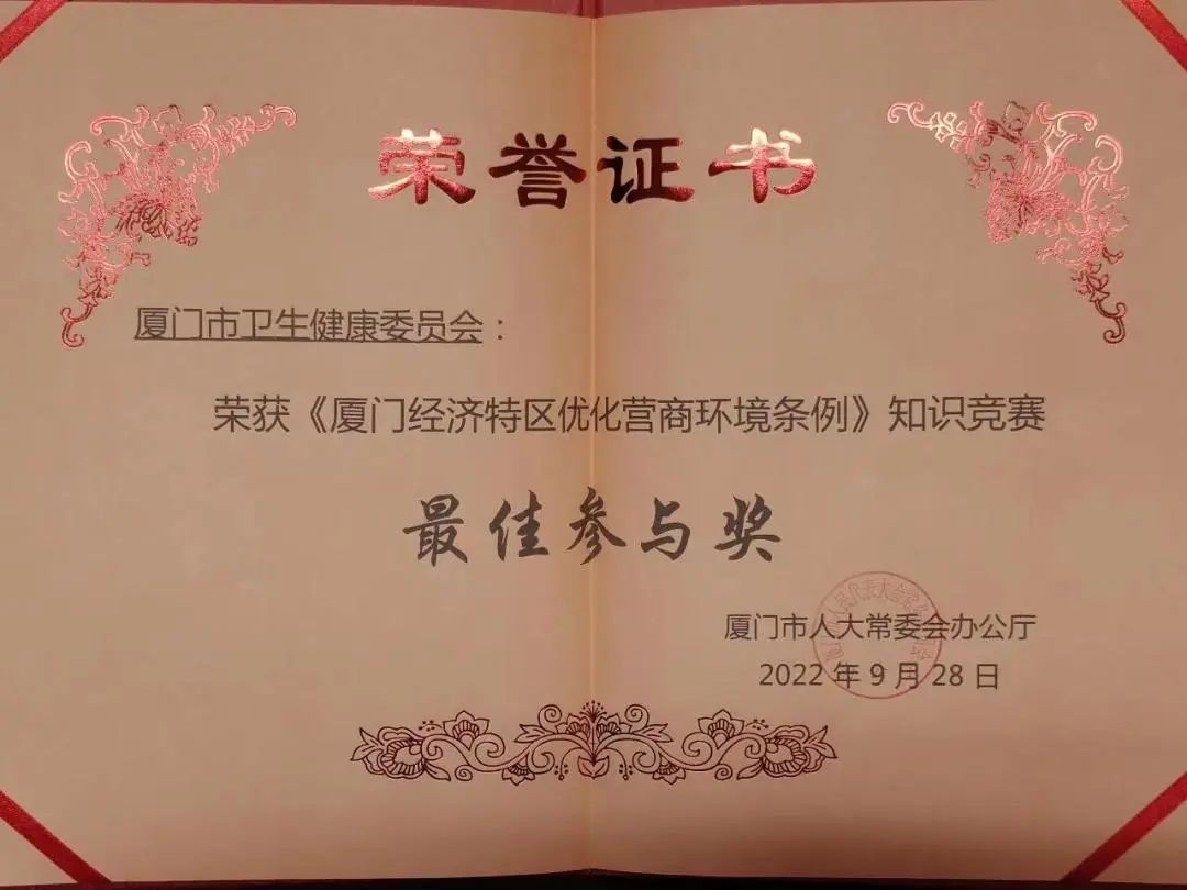 喜报!厦门市卫健委荣获《厦门经济特区营商环境条例》知识竞赛“最佳参与奖”!