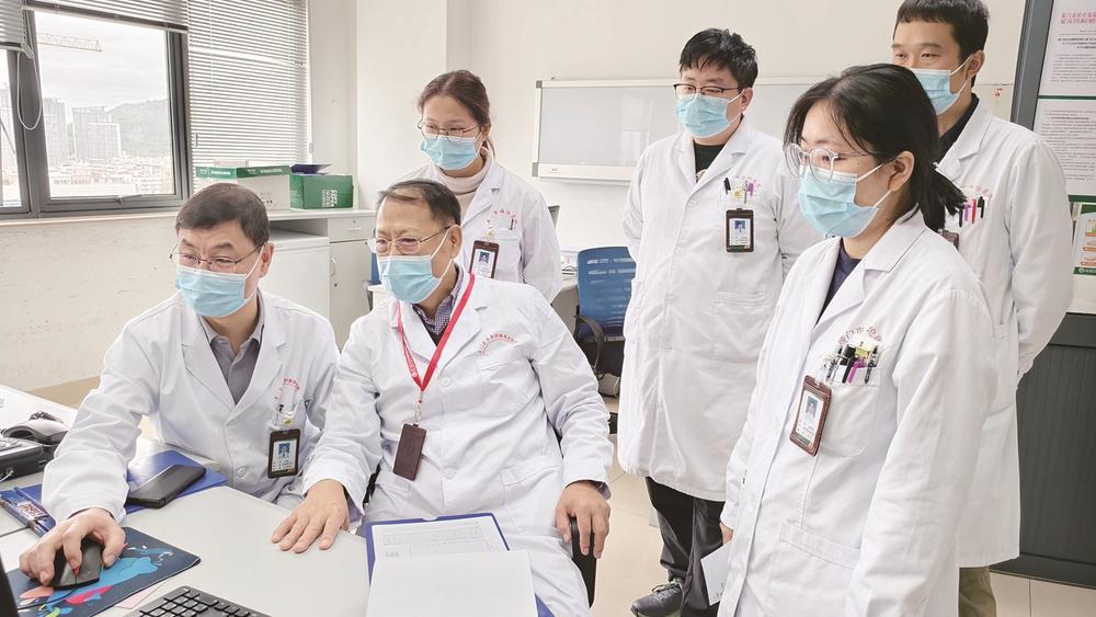 ▲叶辉副书记(左一)团队和特聘专家北京协和医院耳鼻咽喉头颈外科高志强教授(左二)共同探讨病例。